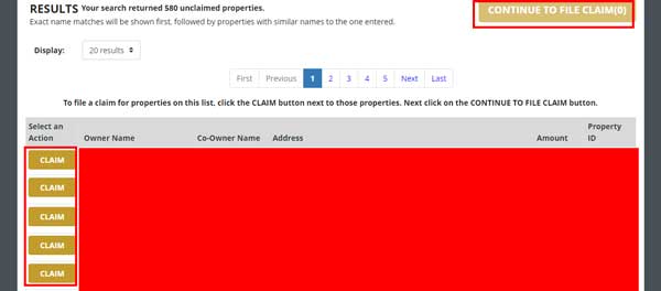 - Once we have found the property(ies), we select them by clicking on “Claim”. When we finish selecting, click on “Continue to file claim”.